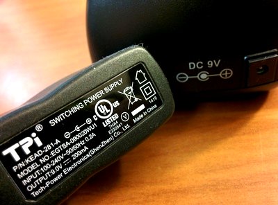 The AC adapter provides 9.0v and is rated at 200mA. It has a positive tip on the connector. It's model number is KEAD-281-A. This is the same AC adapter that is used with the MR350R charging cradle.