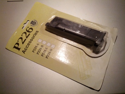 A few days ago, Airsoft Megastore started a clearance on the "Airsoft SY-Tactical P726 / P826 Gas Blowback Pistol Metal Magazine" for $10.47. That's a super great The title of the magazine seems peculiar, since I never heard of the P726 nor the P826. Looking at the magazine online closely, it seems the SY-Tactical P726/P826 magazine is exactly the same as the WE F226 (a Sig Sauer P226 replica) magazine. So I have taken the plunge and order three of them.