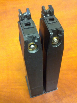 The photo above shows the right side of the magazines. The Shun Yang Toys P226 magazine on the left, while the WE F226 magazine on the right. Like the left side, the magazines are identical except for the slight difference in texture.